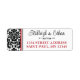These black and white damask pattern wedding return address labels have a damask pattern on the left side with the text area in white that matches the wedding invitation set below. Your name(s) and return address are in black and red lettering with an ornate black scroll divider between them.