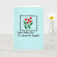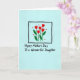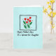 This greeting card features a pale blue background that feels calm and open, framing a simple floral scene with a gentle, affectionate mood ❤️. In the upper half, five red tulip blooms stand close together like a small bouquet, their slender green stems and long deep-green leaves leaning in as if sharing a quiet moment. The flowers sit inside a thick black square outline, with a lighter near-white square behind them that adds depth without distracting from the bouquet. Small red dots are scattered around the tulips inside the frame, like drifting petals or bits of confetti that soften the geometry. Beneath the framed illustration, the message “Happy Mother’s Day To a Wonderful Daughter” is centered and written in a warm reddish tone, giving the words a tender, friendly presence 🌼. The text sits in the lower portion with generous spacing, leaving the flowers to hold the spotlight above. The red tulips and dotted accents stand out sharply against the pale blue field, all contained within the black square border and its pale inner panel.