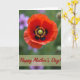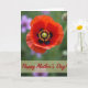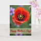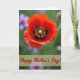 This greeting card features a tall, vertical close-up of a single red flower filling most of the frame, its thin, lightly crinkled petals opening like a gentle embrace ❤️. Near the center, dark near-black crescents sit at the base of the petals, circling a cluster of golden-yellow stamens and a textured, lime-green center. The background fades into a soft blur of leafy greens with faint hints of lavender, giving the bloom a romantic, just-picked focus. Natural light falls across the petals, revealing delicate ridges and a slight sheen on the pollen tips. Across the lower middle, the words “Happy Mother’s Day!” appear on a semi-transparent band in a dark, graceful lettering style, easy to read without overpowering the image 🌼. The text sits centered and low, leaving the flower’s face unobstructed while still feeling close and intimate. The overall scene feels like a quiet garden moment, with the flower’s open shape suggesting a tender, caring connection. Behind the bloom, the green-and-lavender blur stays smooth and airy, with no sharp edges competing for attention.