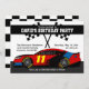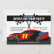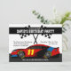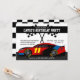 This race car birthday invitation comes with a banner that displays the name the birthday party is for. Below the banner are racing flags. The birthday party details are near the center of the invite above the car. The option to customize the number on the side of the car with an age, favorite number, etc. is available. The contact info for RSVP is at the bottom.