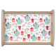This cute kitchen serving tray features a blue, red, pink, and white pattern of boho style coffee pots, cups, sugar jars and spoons, as well as flower and berry images. Bright and colorful!