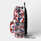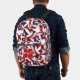 This cool volleyball backpack features a random pattern of varied size red, blue & white volleyballs turned every which way on a white background - customize with the athlete's name & jersey number - by katz_d_zynes