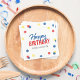Confetti happy birthday napkin featuring confetti in red, blue and yellow.