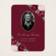 Beautiful red floral memory card/funeral prayer card featuring a photo adorned with blush pink and burgundy red roses and baby's breath on a dark red background.