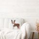 Destei's original cartoon illustration of a cute red and white coat color Boston Terrier breed dog. The background has a pattern of gray dog paw prints.