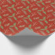 This gift wrap features a botanical design with leaves, holly, branches, wreaths and red berries against a rich red background.