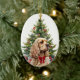 On the front of this Holiday ornament is the image of a buff colored Cocker Spaniel Dog wearing a festive red bow. The dog sits in front of a decorated Holiday tree. On the back, red and green text says MERRY CHRISTMAS", and there are additional text fields for you to customize. Make it say whatever you'd like!