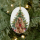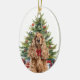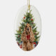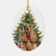 On the front of this Holiday ornament is the image of a buff colored Cocker Spaniel Dog wearing a festive red bow. The dog sits in front of a decorated Holiday tree. On the back, red and green text says MERRY CHRISTMAS", and there are additional text fields for you to customize. Make it say whatever you'd like!