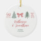 Commemorate a beautiful wedding with this charming personalized Christmas ornament, featuring hand-drawn red bows and evergreen trees for a cozy, festive touch. The elegant script typography highlights the couple’s names and wedding date, making this ornament a timeless keepsake for newlyweds or a thoughtful holiday gift for couples.