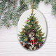 On the front of this Holiday ornament is the image of a little Havanese Dog wearing a festive red bow. The dog sits in front of a decorated Holiday tree. On the back, red and green text says MERRY CHRISTMAS", and there are additional text fields for you to customize. Make it say whatever you'd like!