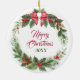 This pretty Holiday ornament features a beautiful black and tan Doberman Pinscher dog framed by a festive holly and red berry wreath. The wreath is decorated with a red bow at the top. The back of the ornament has the same wreath, with two text fields for you to customize.