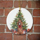 On the front of this Holiday ornament is the image of a pretty Irish Setter Dog wearing a festive red bow. The dog sits in front of a decorated Holiday tree. On the back, red and green text says MERRY CHRISTMAS", and there are additional text fields for you to customize. Make it say whatever you'd like!