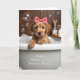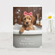 Designed with a cozy bath-time scene, this Mother’s Day card features a golden-furred puppy sitting in a white tub, looking up with wide dark eyes that feel like a gentle, affectionate gaze ❤️. A red bow with small white polka dots rests on its head, adding a sweet touch against the soft fur. The puppy peeks out from a mound of shimmering bubbles that catch the light like tiny pearls, giving the moment a tender, pampered feel. Behind the tub, light wooden paneling and a few spa-style items, like a reed diffuser and a smooth pump bottle, set a calm, cared-for setting. The lighting is soft and diffused, making the bubbles glow and the porcelain surface look silky. Along the outside of the tub, the message “Happy Mother’s Day” appears with “Time to ‘Paws.’” nearby in a dark, easy-to-read print, placed where it follows the curve of the tub. The red bow stands out as the brightest accent in the scene, while pale whites, honey-gold fur, and warm wood tones keep the palette gentle 🌼. The frame stays close on the puppy’s face and the bubble-filled tub, with the text sitting neatly across the tub’s front.