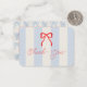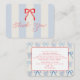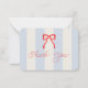 This coquette baby shower thank you note card features a red bow on a cream background with light blue stripes. The reverse side features a cream background with a light blue bow pattern. Personalize it for your needs. You can find matching products at my store.