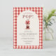 Charming Shes Ready to Pop baby shower invitation featuring a red bow and classic gingham design. Perfect for a fun and festive baby shower with a playful pop theme and cozy country style. Ideal for celebrating with family and friends in a cheerful, coordinated setting. Editable text. Print ready layout.