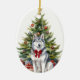 On the front of this Holiday ornament is the image of a beautiful Siberian Husky wearing a festive red bow. The dog sits in front of a decorated Holiday tree. On the back, red and green text says MERRY CHRISTMAS", and there are additional text fields for you to customize. Make it say whatever you'd like!