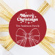 A red background, white text and hand-drawn bow. Merry Christmas is written with an elegant hand-lettered style script. Personalize and add your family name.