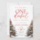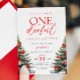 Red Bow Winter Onerderland Girl 1st Birthday Invitation with pine trees and red bow details.