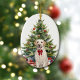 On the front of this Holiday ornament is the image of a beautiful yellow Labrador Retriever dog wearing a festive red bow. The dog sits in front of a decorated Holiday tree. On the back, red and green text says MERRY CHRISTMAS", and there are additional text fields for you to customize. Make it say whatever you'd like!