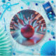 A bowling ball is in motion on a lane, speeding towards the pins with a dynamic energy effect