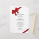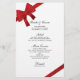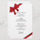 Customize the festive Red Bows Winter Wedding Menu with the details of the meal that you will serve at your December bridal shower luncheon, marriage reception dinner or post wedding brunch by adding the salad or first course, entree or second course and dessert or third course. Personalize it with the names of the bride and groom, venue location and event date. This elegant custom wintery wedding menu features a red and white bow design adorning the corners that resembles a wrapped Christmas present.