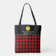 Super cute double-sided tote bag for your pickleball paddle and gear. Design features a yellow pickleball, two lines of custom text set above a red and black plaid buffalo check pattern. Get matching totes for your club, team or pickleball trip . . . Makes a nice gift for the pickleball player in your life.