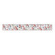 A holiday wrapping ribbon featuring watercolor painted Eurasian bullfinch birds feasting on red and blue berries with pine cones and branches in a repeat pattern on a white background.