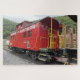 Photo of a red caboose bringing up the rear in an historic coal mining town