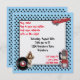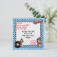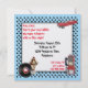Square pearl shimmer invitation with classic 50s icons (red Cadillac, 45 rpm record, red diner pay phone, cherry-topped sundae) in three corners of a white square with a black border on a background of 50s-style black polka dots on blue. The back is white with a matching black polka dots on blue border. See custom-cut vinyl sticker. See the entire Nifty 50s Invitation collection in the INVITES | Invitations section.