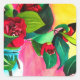 Original watercolor art of floral Red Camellia flowers with green foliage against a colourful vibrant pink and yellow background. By artist Sacha Grossel, this botanical flower design is stunning.