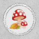 Cute cartoon illustration of toadstool red-capped mushrooms and fall colored leaves.
