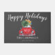 Watercolor graphic features retro red colored beetle style car loaded on top with freshly cut Christmas tree and colorful wrapped presents. Customizable holiday greeting with room for your family or business name. Chalkboard gray background.