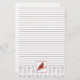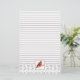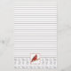 A pretty lined stationery paper decorated with a bright red cardinal bird painted with watercolor accented with a border of leaves drawn in black pen and ink. Nice for letter writing, journaling and more!