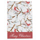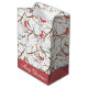 A Christmas gift bag shown in Medium with "Merry Christmas" in a formal white typeface on a red border on both sides and a pattern of red cardinals perched on snowy tree branches.