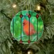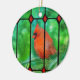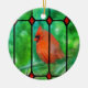 In beautiful holiday colors, this ornament depicts a glorious, red cardinal sitting outside a stained-glass window.