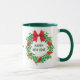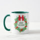 This pretty holiday mug features a green wreath tied with a bright red bow. Around the wreath are scattered little red birds. At the center is the matching green text which says "Merry Christmas", but you may easily change it to anything you'd like. The other side has the same image with the text "Happy New Year". A third text field between the two images can be used for your name. Be sure to see the matching products in our store.