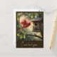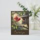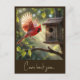 A red cardinal bird returns to his wooden house where probably her little kids are waiting to be fed. The Lovely bird is surrounded by fresh and green trees which makes the atmosphere so inviting.