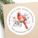 Labels featuring a beautiful watercolor painting of a red cardinal sitting on a snowy branch with red berries, and a custom holiday greeting and your name. Default text "Wishing you a very merry Christmas".