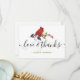 Send a personalized note of thanks to family and friends with this elegant holiday note card. This design template features a red cardinal perched on a branch with red berries. Below it reads Love & Thanks in a modern black script. Customize with your name in green. The back of the card has a personalized thank you message and signature.