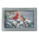 A pair of northern red cardinals perch on a holly branch covered with red berries and snow.