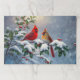 A pair of northern red cardinals perch on a holly branch covered with red berries and snow.