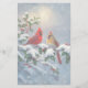 A pair of northern red cardinals perch on a holly branch covered with red berries and snow.