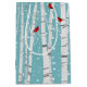 Red cardinal birds in white birch tree on aqua background and snowflakes.