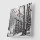 Red cardinals perch on snow-covered branches of trees in a wintry forest with snowflakes