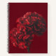 Notebook with a dark red, burgundy background and beautiful red carnation flowers.