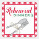 Set a fun, festive tone for your wedding rehearsal dinner with this red checkered square sticker. A classic red and white gingham border frames featured text reading "Rehearsal Dinner" in playful mixed typography alongside a charming fork and knife illustration. The casual, inviting design is perfect for Italian dinner themes or backyard celebrations. Ideal for favor bags, gift boxes, or party accents. All text is fully customizable.