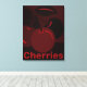 The red cherries show a monochromatic black background. The cherry canvas print is perfect to decorate a kitchen wall. Three red cherries, a triplet with a typed caption cherries in the red background color. How to customize the template? Choose the background color. With this selection, you define the general hue of the monochromatic blackish canvas print. The descriptive caption allows changing the font, the language, and the font color. In the example, the font color displays the red background color.