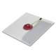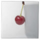 Red cherry hangs from the brim of the gray porcelain cup against white background. The summertime theme