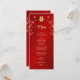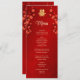 Red cherry blossoms and a gold double happiness symbol on a shimmering red background. With custom bride and groom names, the wedding date and a custom menu text.