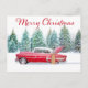Red Chevrolet and Christmas Conifers. "Merry Christmas" Greeting text.